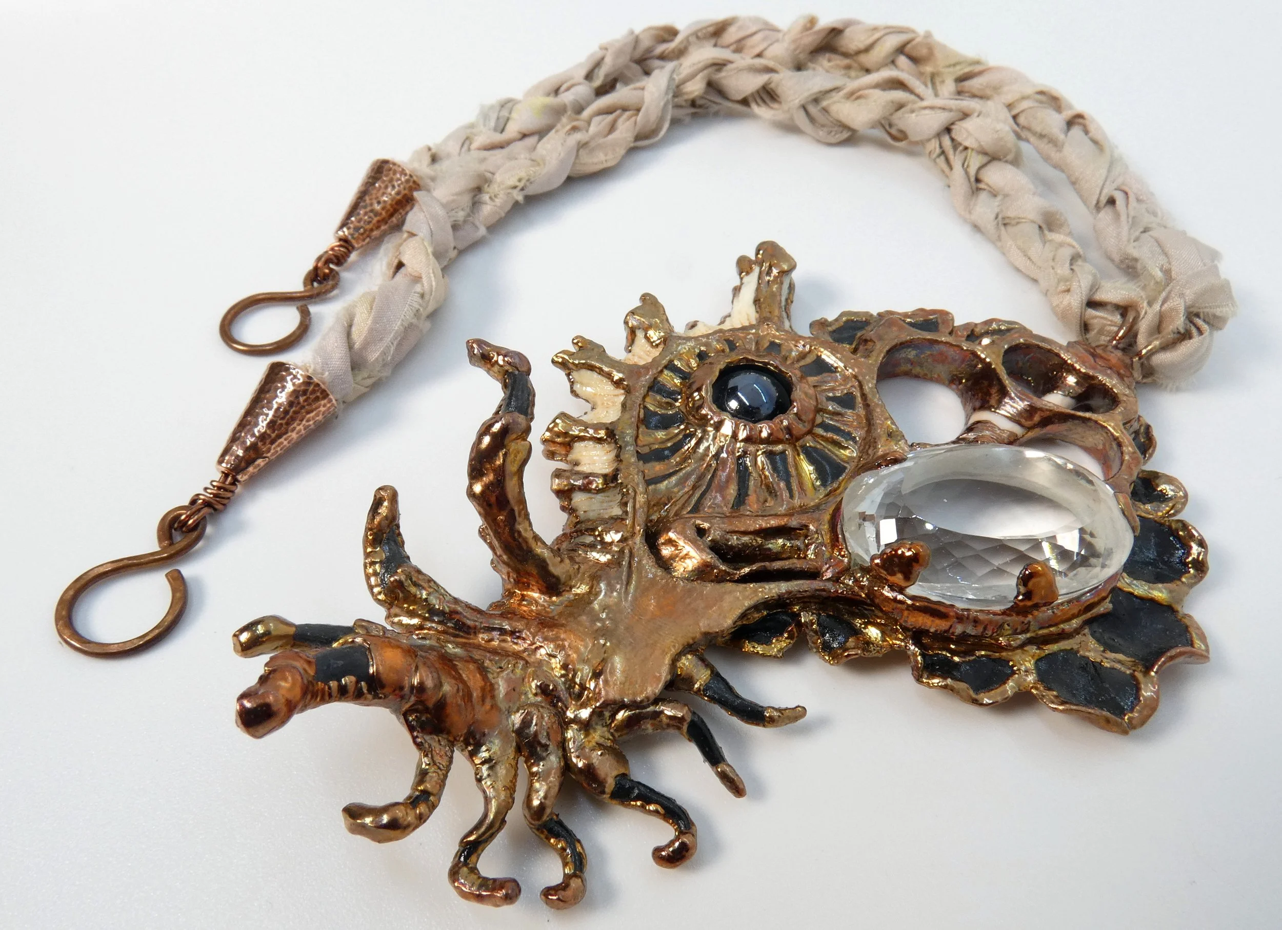 Opalized ammonite fossil, labradorite eyes, epoxy clay, sari silk, copper wire and chain, electroformed in copper.