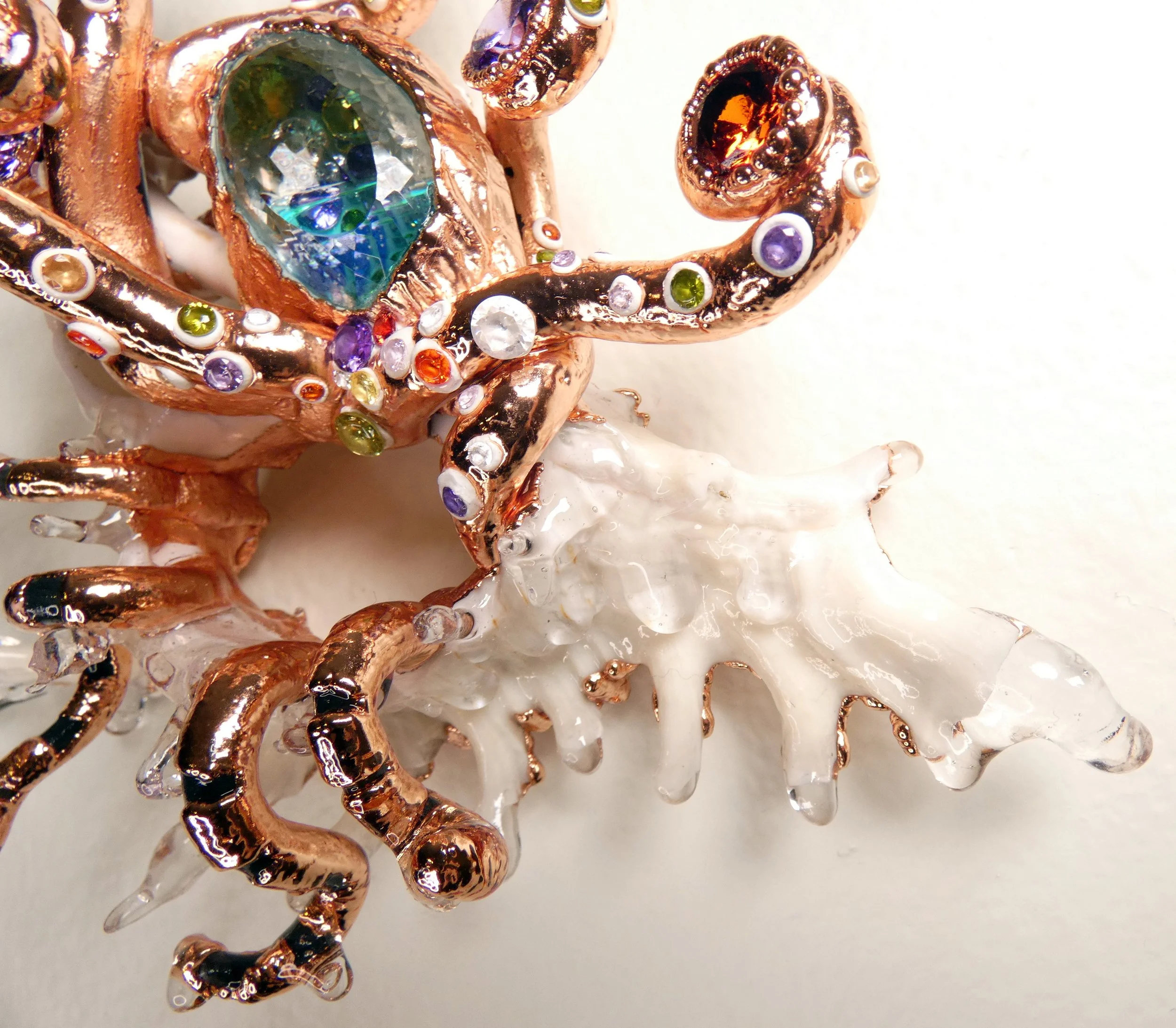 Seashell slice, faceted quartz, moving glass marble, epoxy clay, electroformed in copper.